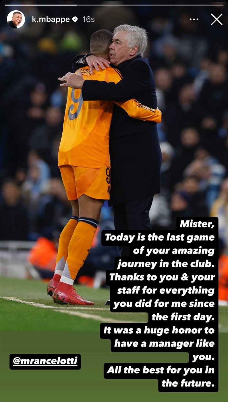 وجّه النجم الفرنسي كيليان مبابي، مهاجم فريق ريال مدريد الإسباني، رسالة مؤثرة لمدربه الإيطالي كارلو أنشيلوتي، بمناسبة رحيل الأخير عن تدريب الميرنجي.