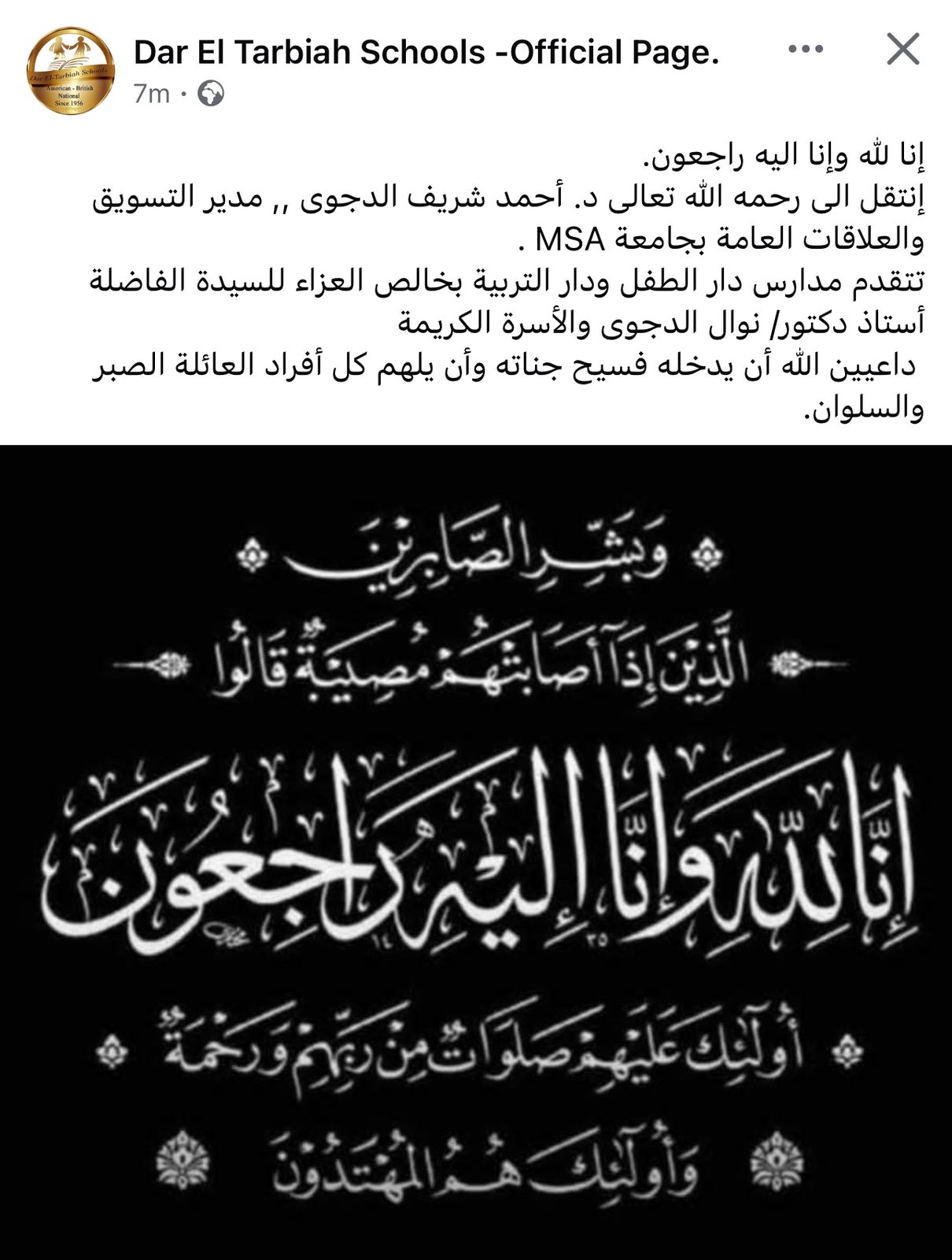 وكتبت إدارة مدرسة نوال الدجوى عبر حسابها على موقع التواصل الاجتماعي "فيسبوك":"إنا لله وإنا إليه راجعون.. انتقل إلى رحمة الله تعالى د. أحمد شريف الدجوي مدير التسويق والعلاقات العامة بجامعة MSA، وتتقدم مدارس دار الطفل ودار التربية بخالص العزاء للسيدة الفاضلة أستاذ دكتور نوال الدجوي والأسرة الكريمة.
