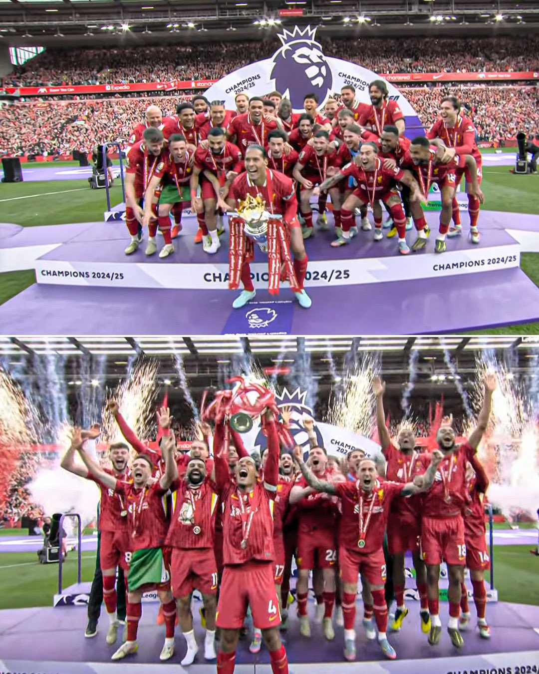 انطلقت مراسم التتويج مباشرة بعد صافرة النهاية وسط أجواء احتفالية حماسية، حيث شهدت مدرجات أنفيلد حضورًا جماهيريًا ضخمًا للاحتفال باللقب الغالي، الذي غاب عن خزائن النادي منذ موسم 2019/2020. وتسلّم قائد الفريق فيرجيل فان دايك الكأس وسط زملائه، في لحظات خالدة أعادت أمجاد ليفربول التاريخية.
