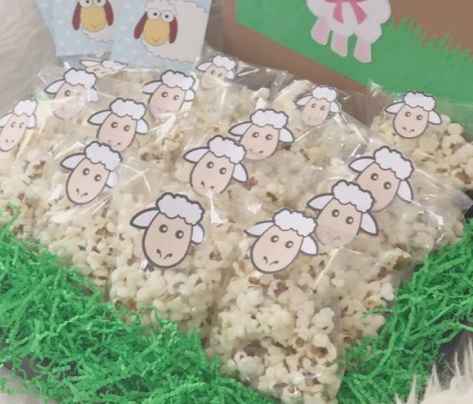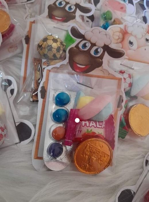 وضع حلوى المارشيملو المفضلة إلى الأطفال في بعض الأكياس البلاستيكية المزخرفة برسومات خروف العيد.