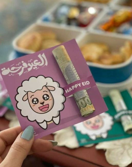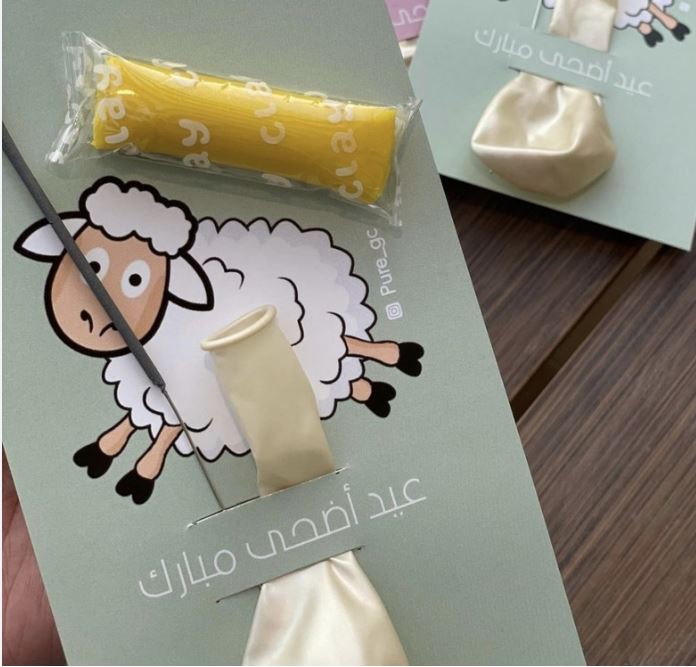 وضع العيدية داخل أكياس من الكاندي، مجسم خروف صغير بالون ملون.