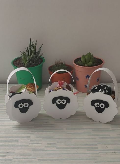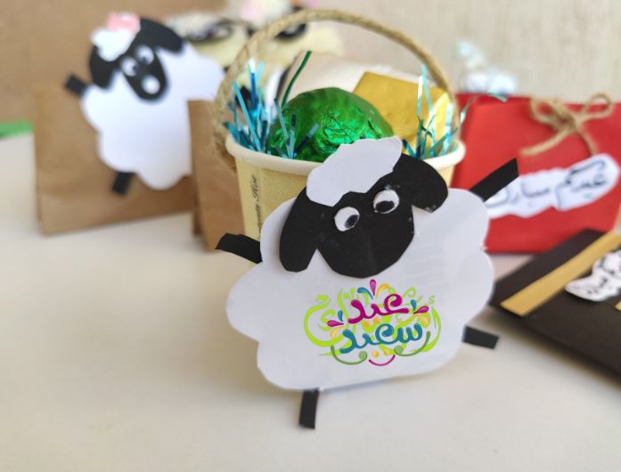 إعداد بعض المجسمات الورقية الملونة على شكل خروف العيد، ومن ثم استخدامها في وضع نوعيات الحلوى المفضلة إلى قلوب الأطفال مثل الشيكولاتة أو المارشميلو وغيرها..