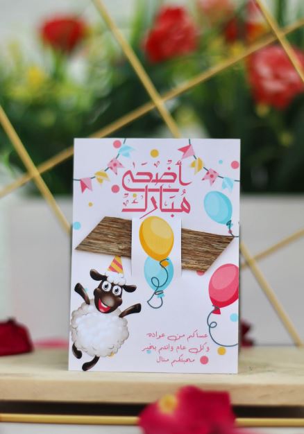 إعداد كارت تهنئة صغير وبسيط مدون عليه مجموعة من أجمل كلمات التهنئة والمعايدة بمناسبة اقتراب العيد، ومثبّت عليه بعض قطع الحلوى الصغيرة مثل مكعبات الشيكولاتة اللذيذة.