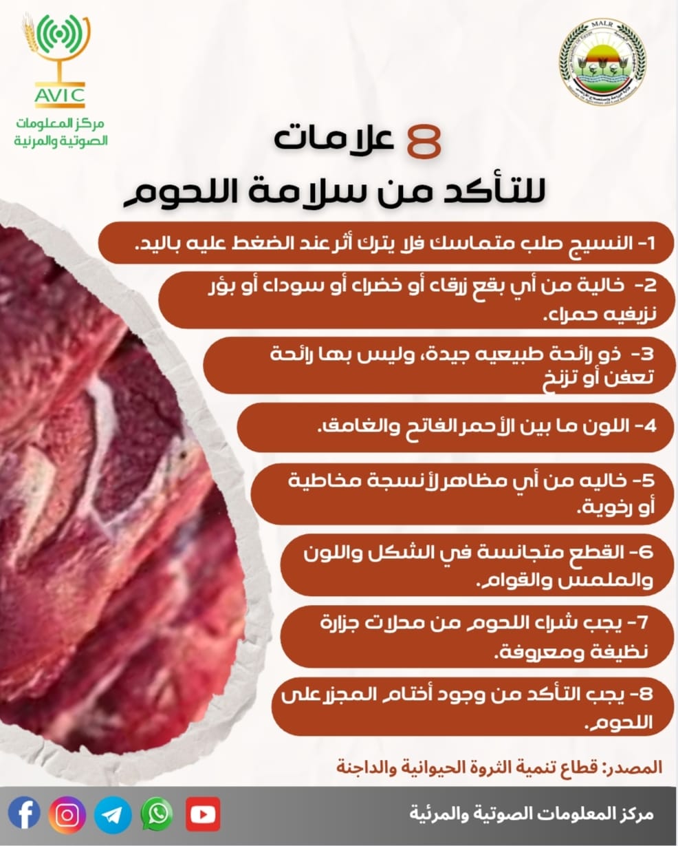 وفيما يتعلق بسلامة اللحوم، حدد قطاع تنمية الثروة الحيوانية والداجنة بالوزارة 8 علامات مهمة للتأكد من سلامة اللحوم، حيث يكون اللون ما بين الأحمر الفاتح والغامق، كذلك النسيج صلب متماسك فلا يترك أثر عند الضغط عليه باليد، فضلا عن التأكد من كونها خالية من أى بقع زرقاء أو خضراء أو سوداء أو بؤر نزيفيه حمراء.