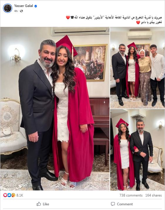 هنأ النجم ياسر جلال أبنته قدرية وذلك بعد تخرجها من الثانوية العامة الألمانية بتفوق معبرا عن سعادته وفخره بها ونشر مجموعة من صور الاحتفال من داخل منزله عبر صفحته الرسمية "فيس بوك" وكتب " مبروك يا قدرية التخرج من الثانوية العامة الألمانية "الأبيتور" بتفوق مشاء الله ، فخور بيكي يا دادو".