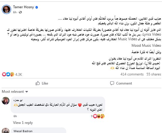 وأختتم " انتظروا التراك القادم من ألبوم لينا ميعاد بعنوان (حبيبي تقلان)، توزيع الموزع المصري العالمي علي فتح الله اليوم الساعة السادسة مساءً إن شاء الله ".