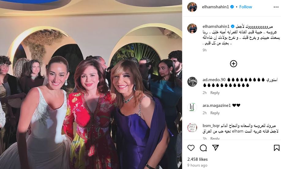 ونشرت شاهين صورة تجمعها بالعروسة والإعلامية لميس الحديدي عبر صفحتها الرسمية "إنستجرام" وعلقت عليها " مبروووووووووووك لأجمل عروسه .. حبيبة قلبي الفنانه القمرايه أمينه خليل .. ربنا يسعدك حبيبتي و يفرح قلبك .. و نفرح بولادك إن شاءالله .. بحبك من كل قلبي".
