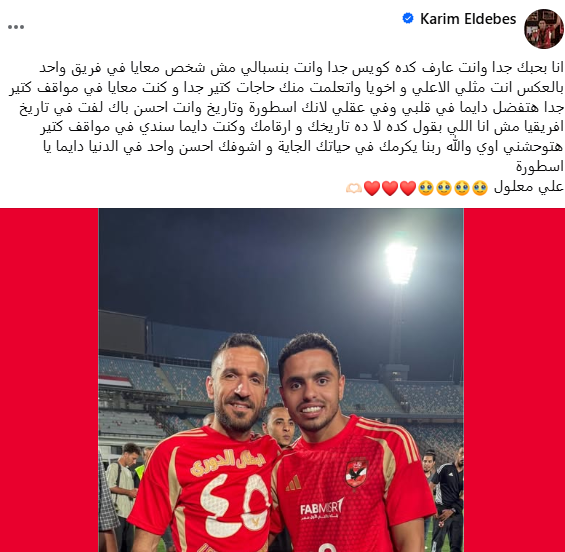 ونشر الدبيس عبر حسابه الرسمي على "فيسبوك" تدوينة كتب فيها: "أنا بحبك جدًا وأنت عارف كده كويس، وأنت بالنسبة لي مش مجرد زميل في الفريق.. بالعكس، أنت مثلي الأعلى وأخويا، واتعلمت منك حاجات كتير، وكنت معايا في مواقف صعبة كتير جدًا".