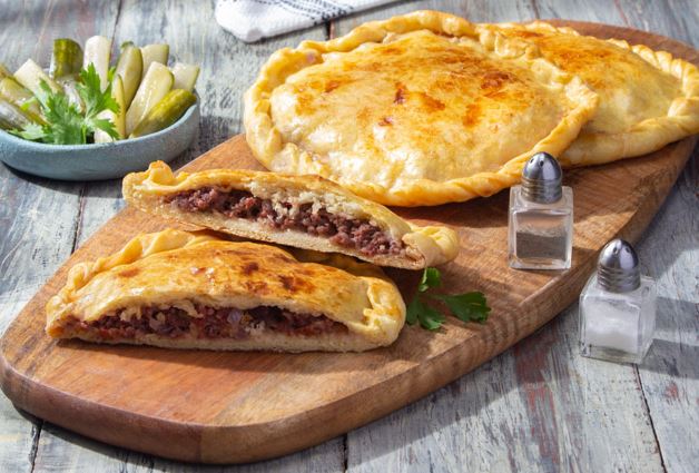 وضع طبقة أخرى من العجين فوق اللحم المفروم ويتم تقفيل أطراف العجين ببعضها البعض ونستكمل باقي الكمية بنفس الطريقة.