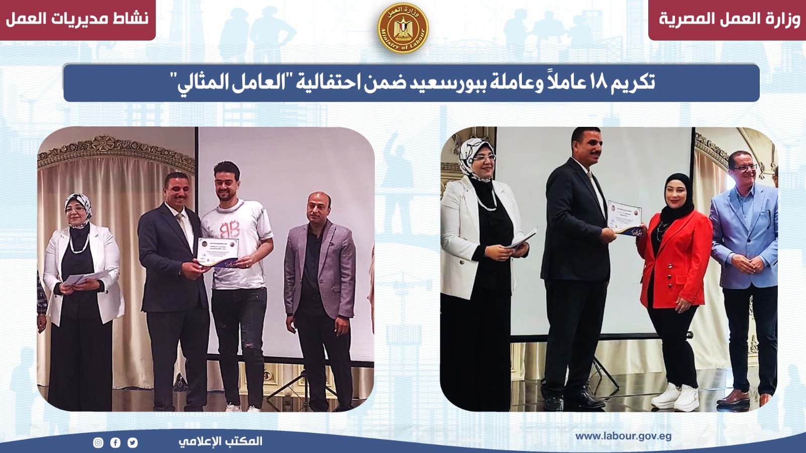 نظّمت مديرية العمل بمحافظة بورسعيد احتفالية لتكريم 18 عاملًا وعاملة من المتميزين بعدد من المنشآت، من بينهم 8 من ذوي الهمم، وذلك تحت شعار "العامل المثالي"، في إطار توجيهات الوزير محمد جبران وزير العمل بضرورة تسليط الضوء على نماذج التميز في مواقع العمل، وإبراز دور ذوي الهمم في دعم مسيرة التنمية والإنتاج.