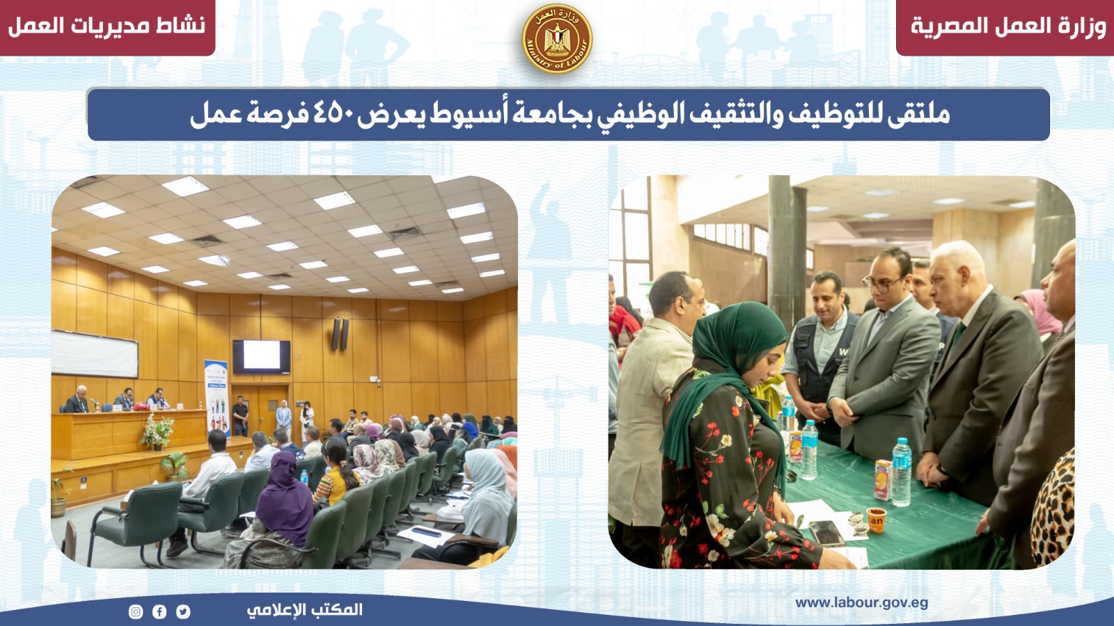 نظّمت مديرية العمل بأسيوط فعاليات ملتقى التوظيف والتثقيف الوظيفي، تحت رعاية وزير العمل محمد جبران، وبحضور الدكتور مينا عماد نائب المحافظ، وذلك بقاعات جامعة أسيوط، بمشاركة عدد من الشركات التي عرضت نحو 450 فرصة عمل لخريجي الدورات التدريبية المنفذة بالشراكة بين الوزارة وبرنامج الأغذية العالمي.