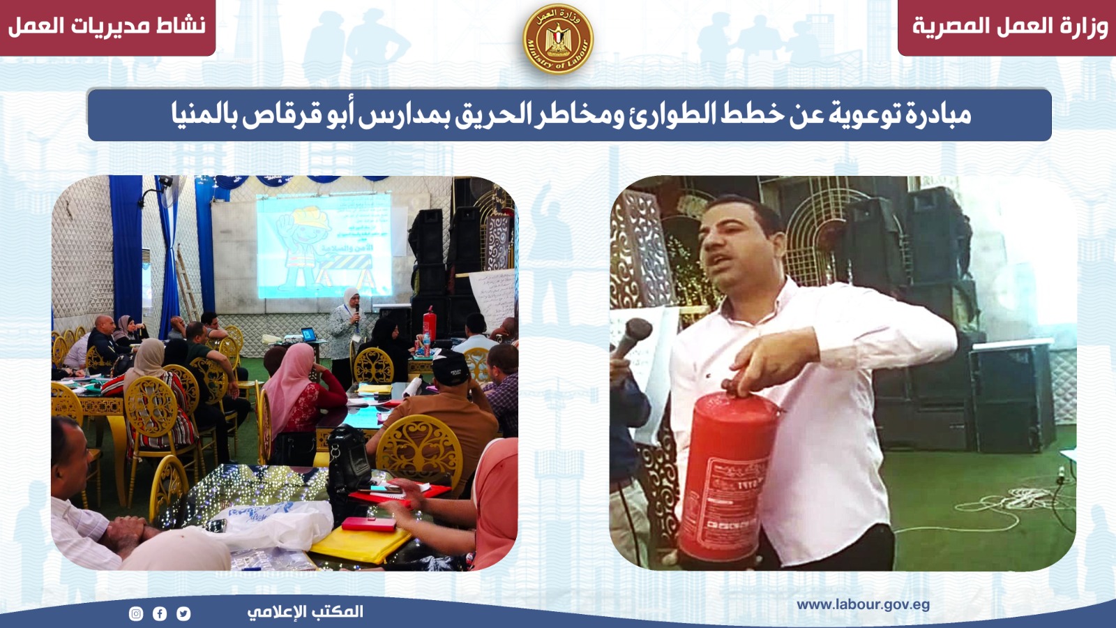 نظّم مكتب السلامة والصحة المهنية بأبو قرقاص التابع لمديرية العمل بالمنيا مبادرة توعوية بعنوان "سلامتك تهمنا"، استهدفت العاملين بالإدارة التعليمية والمدارس التابعة لها، وذلك تحت رعاية وزير العمل محمد جبران، وبإشراف الإدارة المركزية للسلامة والصحة المهنية، وإدارة السلامة بالمديرية.