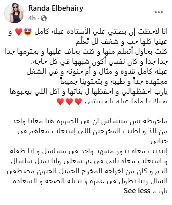 وتابعت: "ملحوظه بس مننساش ان في الصوره هنا معانا واحد من ألذ وأطيب المخرجين اللي إشتغلت معاهم في حياتي، إبتديت معاه بدور مشهد واحد في مسلسل وأنا طفله، واشتغلت معاه تاني في عز شغلي وانا بمثل سلسال الدم و كان من اخراجه المخرج الجميل الحنون مصطفي الشال ربنا يطول في عمره ويديله الصحه و السعاده يارب".