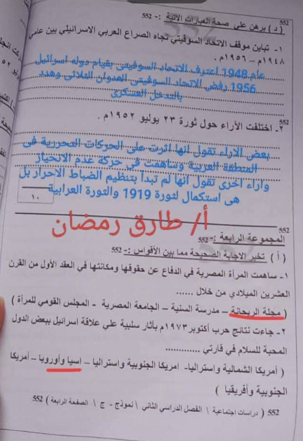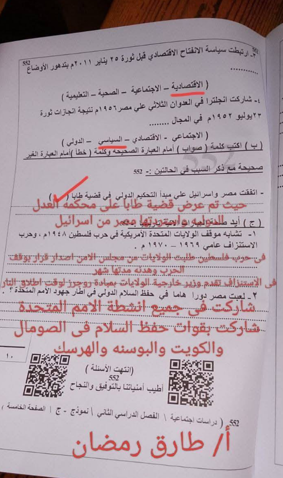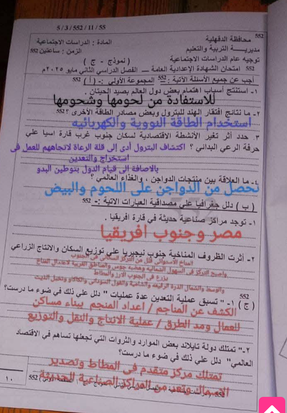 نشر معلمو الدراسات الاجتماعية عبر مواقع التواصل وصفحات التعليم الإلكترونية، نموذجًا لحل امتحان مادة الدراسات في محافظة الدقهلية، ليساعد الطلاب في مراجعة إجاباتهم بدقة.