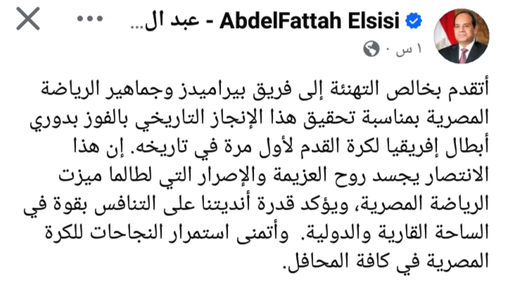 ونشر الرئيس السيسي على صفحته الرسمية على موقع التواصل الإجتماعي فيسبوك: أتقدم بخالص التهنئة إلى فريق بيراميدز وجماهير الرياضة المصرية بمناسبة تحقيق هذا الإنجاز التاريخي بالفوز بدوري أبطال إفريقيا لكرة القدم لأول مرة في تاريخه.
