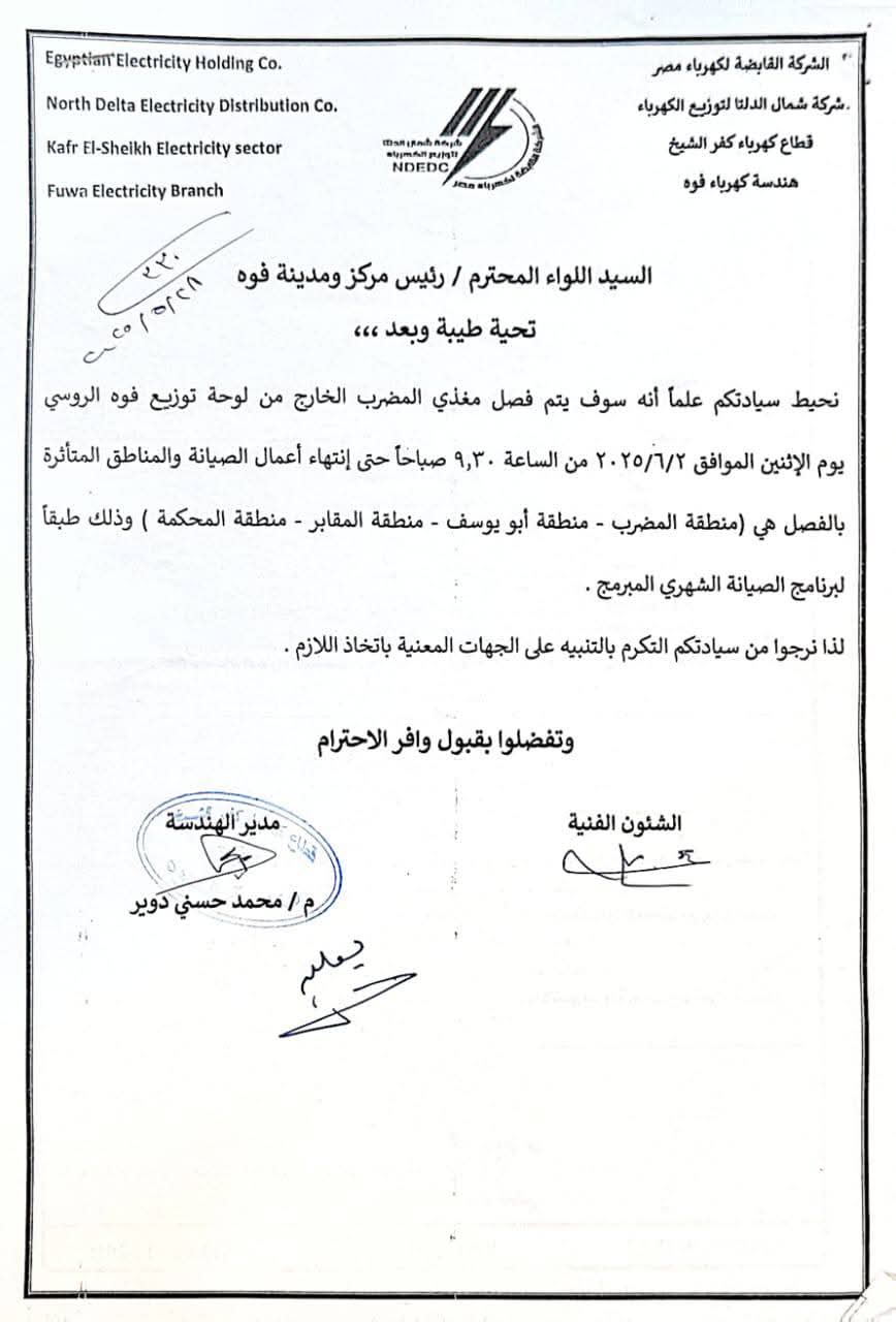 أعلنت شركة الكهرباء بمحافظة كفر الشيخ عن انقطاع الكهرباء، صباح اليوم، عن عدد من المناطق التابعة لمركز ومدينة فوه، وذلك ضمن خطة الصيانة الدورية التي تنفذها فرق الكهرباء لتحسين كفاءة الشبكة.