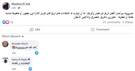 وكتب العدل عبر صفحته الرسمية "فيس بوك" " مبروووك بيراميدز أفضل فريق في مصر وأفريقيا.. ما أن توفرت له الإمكانات حتى تربع على عرش القارة دون جمهور أو منظومة تسانده ظالماً أو مظلوما ،فخورون بالفريق المصري واللاعبين الأبطال.