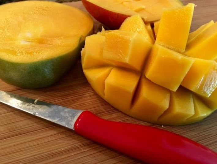 قطعي المانجو إلى شرائح أو قطع صغيرة حسب الرغبة، كما يمكن إزالة النواة منها.