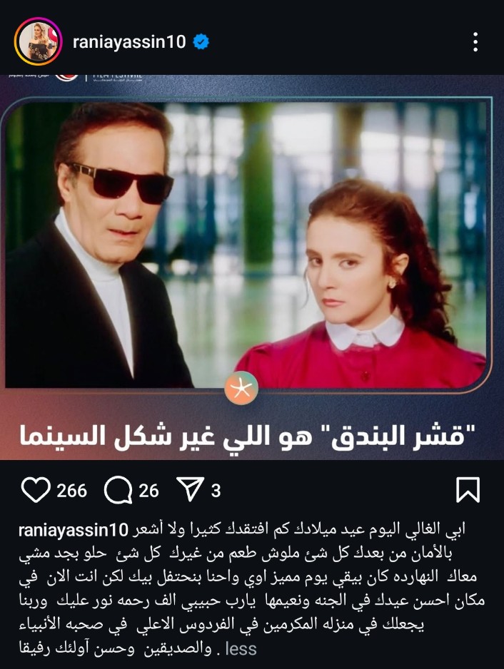 أحيت الفنانة رانيا محمود ياسين ذكرى ميلاد والداها الفنان القدير محمود ياسين، وذلك عبر حسابها الرسمي على موقع التواصل الاجتماعي لتبادل الصور والفيديوهات الانستجرام.