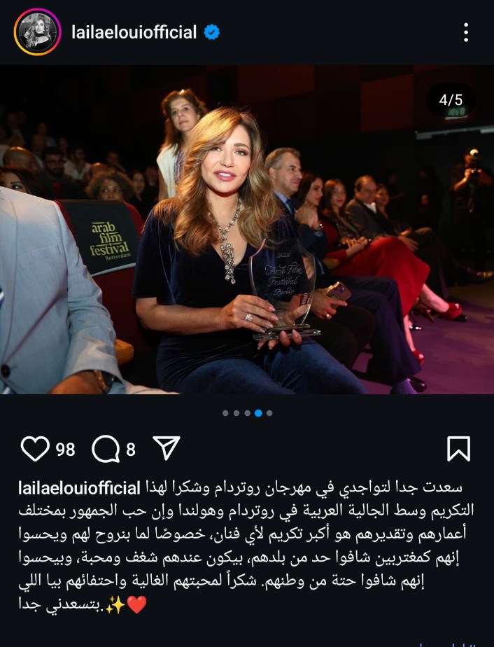 أعربت الفنانة القديرة ليلى علوي عن تكريمها في مهرجان روتردام، مؤكدة أن حب الجمهور هو أكبر تكريم لأي فنان.