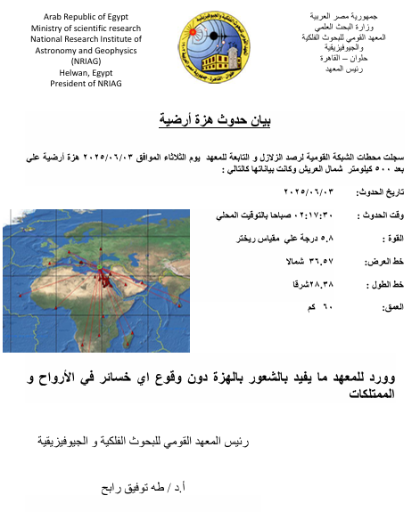 وأشار المعهد، في بيان رسمي، إلى أن محطات الشبكة القومية لرصد الزلازل التابعة له، سجلت مساء اليوم الثلاثاء هزة أرضية على مسافة محددة، وكانت بيانات الهزة كما يلي: