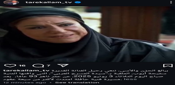 ونشر عبر حسابة الرسمي على موقع التواصل الإجتماعي لتبادل الصور والفيديوهات “الانستجرام”: "ببالغ الحزن والأسى ننعى رحيل الفنانة القديرة سميحة أيوب، الملقبة بـ "سيدة المسرح العربي"، التي وافتها المنية صباح اليوم الثلاثاء 3 يونيو 2025، عن عمر ناهز 93 عاما، بعد مسيرة فنية حافلة امتدت لأكثر من سبعة عقود".
