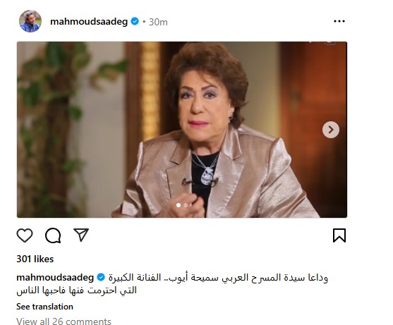 ونشر عبر حسابة الرسمي على موقع التواصل الاجتماعي لتبادل الصور والفيديوهات “الانستجرام”: “وداعا سيدة المسرح العربي سميحة أيوب.. الفنانة الكبيرة التي احترمت فنها فاحبها الناس”.