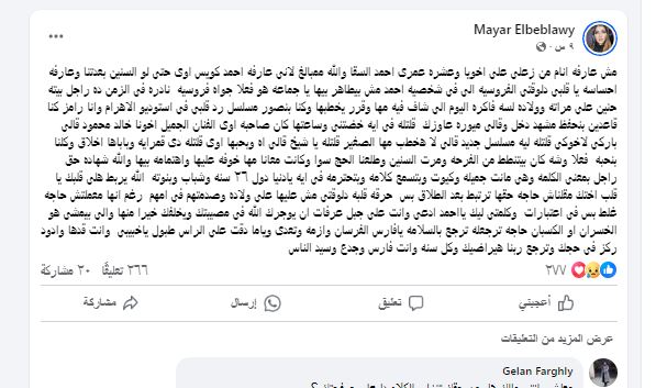 وتابعت "بس حرقة قلبه دلوقتى مش عليها على ولاده وصدمتهم فى امهم رغم انها معملتش حاجه غلط بس فى اعتبارات وكلمتى ليك يااحمد ادعى وانت على جبل عرفات ان يؤجرك الله فى مصيبتك ويخلفك خيرا منها والى بيمشى هو الخسران او الكسبان حاجه ترجعله ترجع بالسلامه يا فارس الفرسان ".