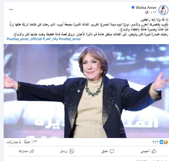 وكتبت عامر عبر صفحتها الرسمية "فيس بوك" إنا لله وإنا إليه راجعون ، بقلوب يعتصرها الحزن والأسى، نودع اليوم سيدة المسرح العربي، الفنانة القديرة سميحة أيوب، التي رحلت عن عالمنا تاركة خلفها إرثًا فنيًا خالدًا ومسيرة حافلة بالعطاء والإبداع".