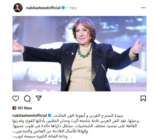 ونشرت عبر حسابها الرسمي على موقع التواصل الاجتماعي لتبادل الصور والفيديوهات “الانستجرام”: "سيدة المسرح العربي و أيقونة الفن الخالده.. برحيلها، فقد الفن العربي قامة شامخه أثرت وجدان الملايين بأدائها القوي وقدرتها الفائقة على تجسيد مختلف الشخصيات ستظل ذكراها خالدة في قلوب محبيها، وإلهامًا للأجيال القادمة من الفنانين والمبدعين، وداعا الفنانة الكبيرة سميحه أيوب".