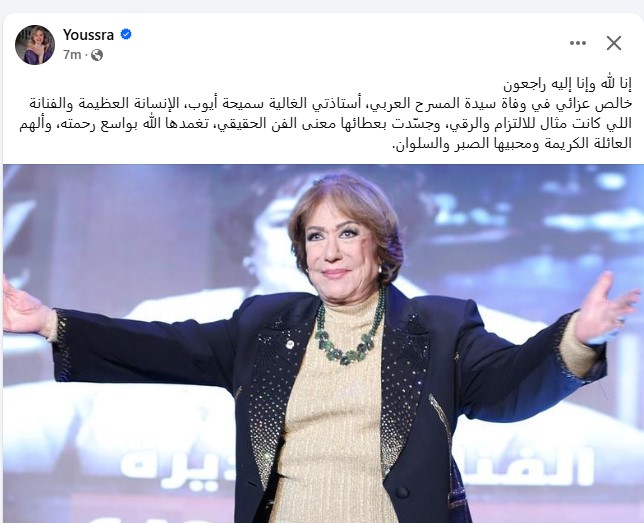 نعت الفنانة يسرا، الفنانة القديرة سميحة أيوب التي رحلت عن عالمنا منذ قليل عن عمر ناهز 93 عاًما.