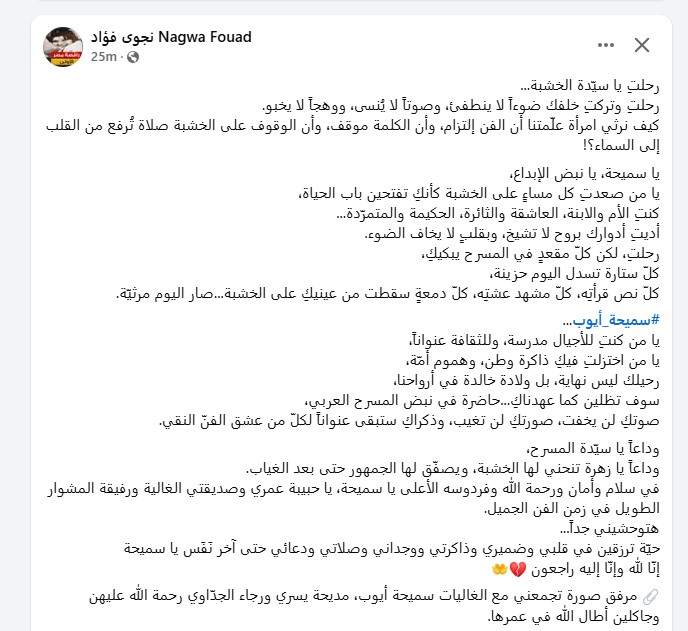 وتابعت: "كيف نرثي امرأة علّمتنا أن الفن إلتزام، وأن الكلمة موقف، وأن الوقوف على الخشبة صلاة تُرفع من القلب إلى السماء؟!، يا سميحة، يا نبض الإبداع، يا من صعدتِ كل مساءٍ على الخشبة كأنكِ تفتحين باب الحياة، كنتِ الأم والابنة، العاشقة والثائرة، الحكيمة والمتمرّدة".