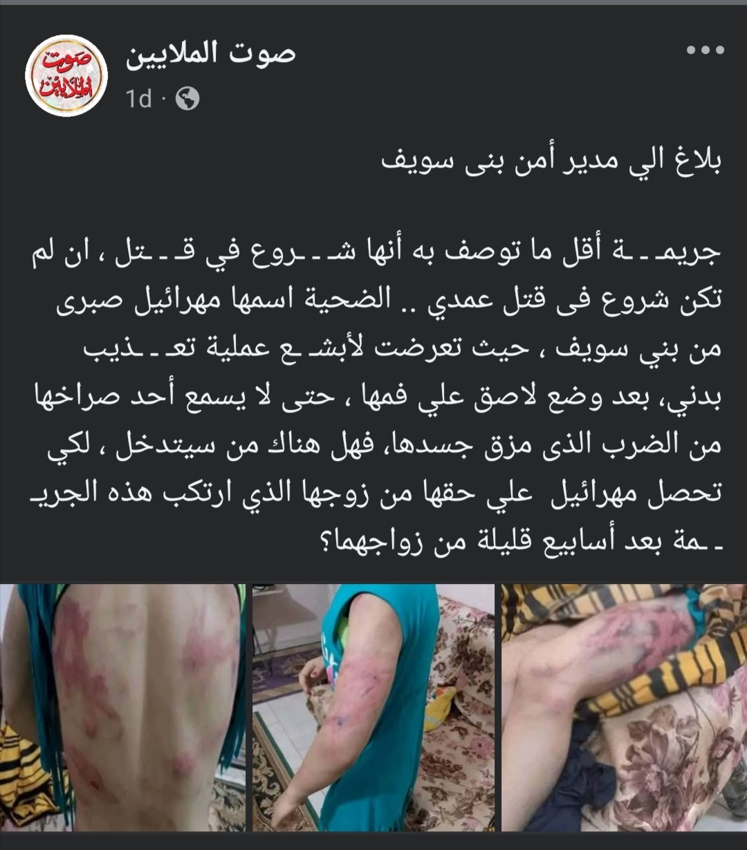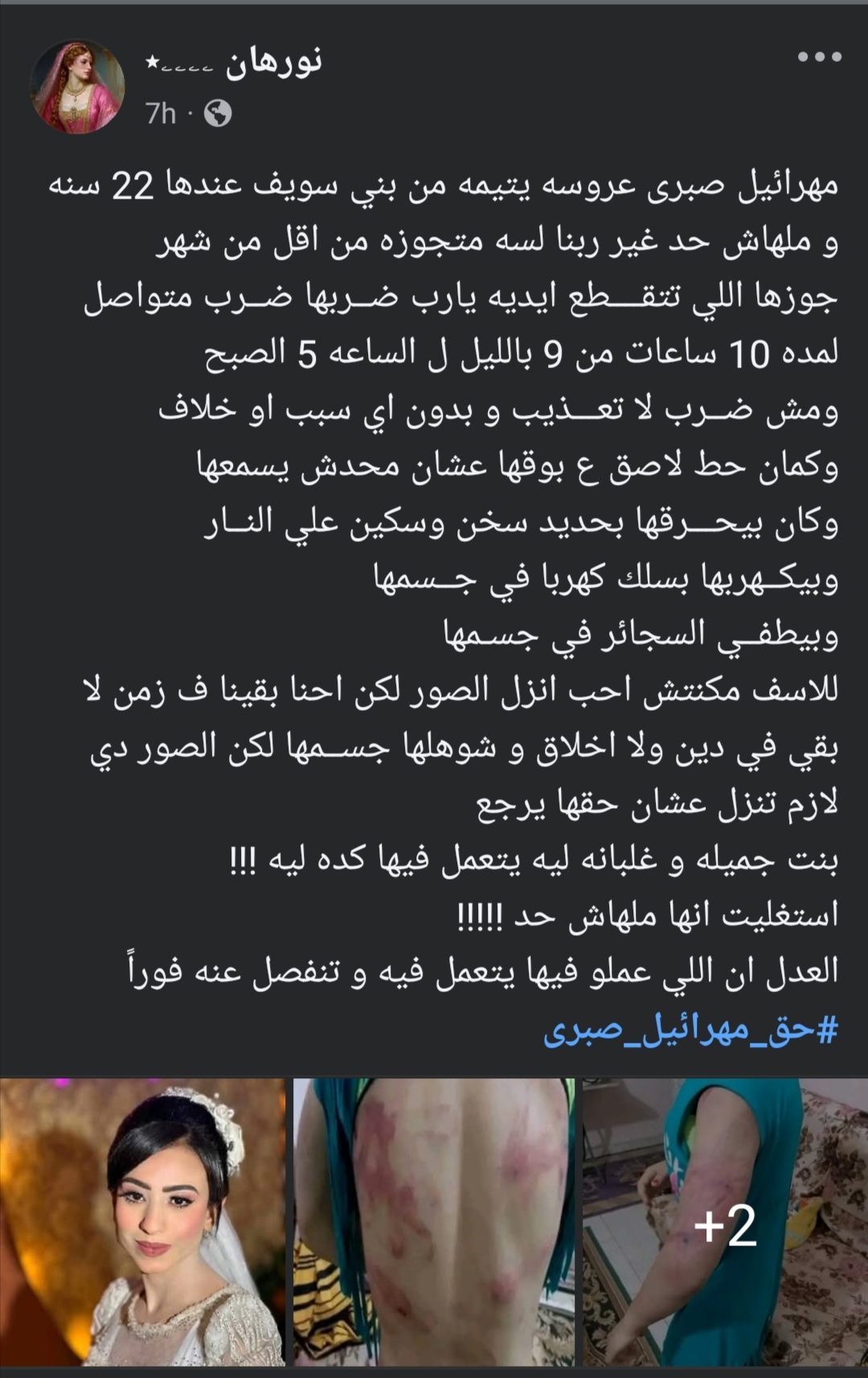 تمكنت قوات أمن بني سويف من ضبط زوج العروس "مهرائيل صبري"، البالغة من العمر 22 عامًا، والذي قام بالتعدي على زوجته بوحشية لمدة 8 ساعات متواصلة، محدثًا بها إصابات بالغة الخطورة، في واحدة من أبشع صور العنف الزوجي والأسري.