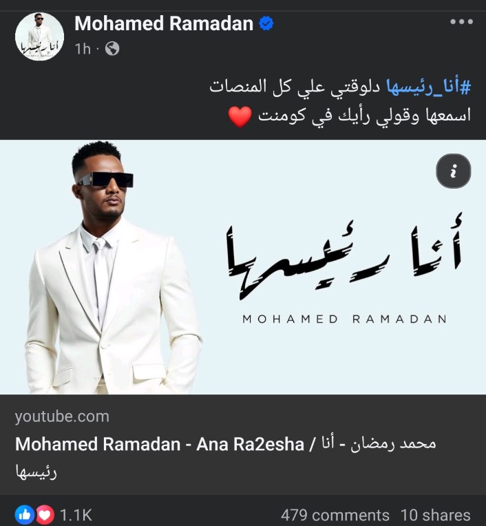 ونشر محمد رمضان اغنية "أنا رئيسها “ عبر حسابه الرسمي على موقع التواصل الاجتماعي الفيسبوك: ”أنارئيسها دلوقتي علي كل المنصات، اسمعها وقولي رأيك في كومنت".