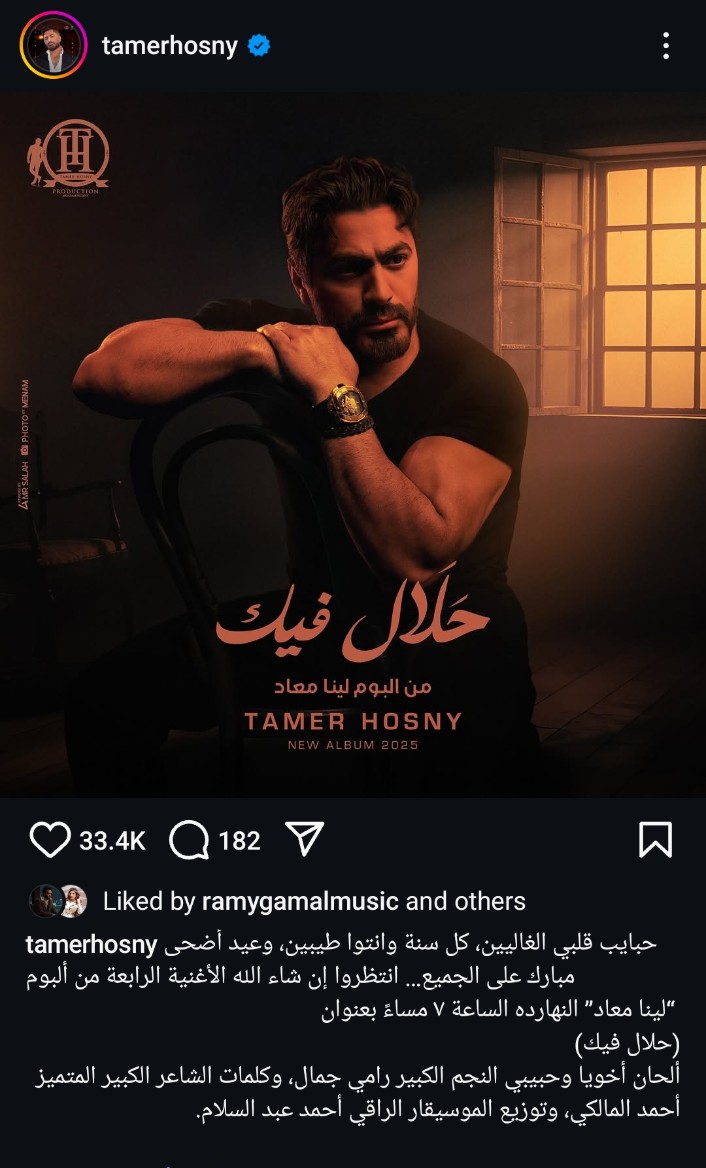 ونشر تامر حسني عبر حسابه الرسمي على موقع التواصل الاجتماعي لتبادل الصور والفيديوهات الانستجرام: “حبايب قلبي الغاليين، كل سنة وانتوا طيبين، وعيد أضحى مبارك على الجميع ... انتظروا إن شاء الله الأغنية الرابعة من ألبوم لينا معاد النهارده الساعة 7 مساءً بعنوان حلال فيك”.