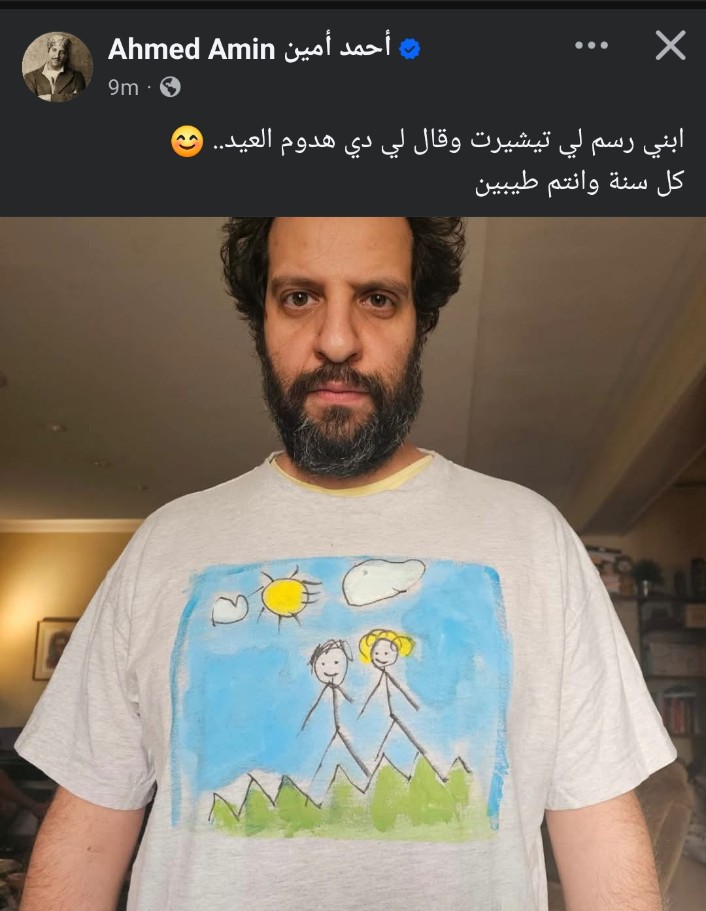 ونشر الفنان أحمد أمين عبر حسابه الرسمي على موقع التواصل الاجتماعي الفيسبوك: “ابني رسم لي تيشيرت وقال لي دي هدوم العيد، كل سنة وانتم طيبين”.