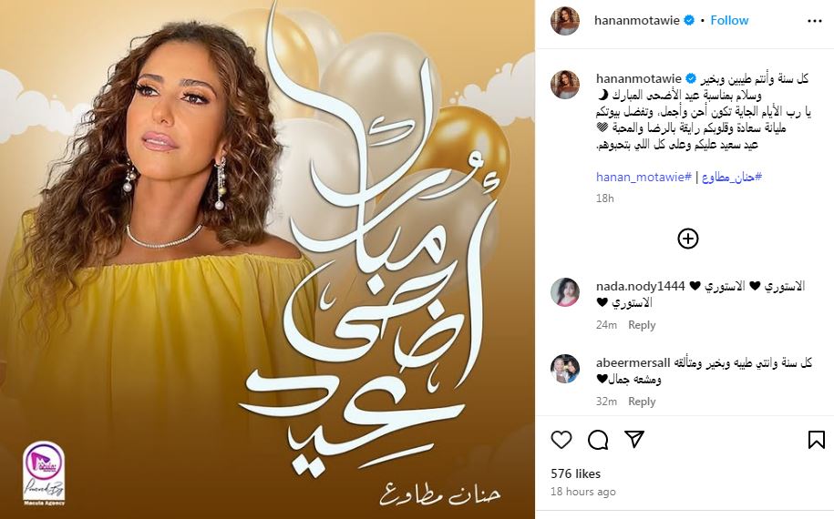 وهنأت الفنانة حنان مطاوع جمهورها عبر صفحتها الرسمية " كل سنة وأنتم طيبين وبخير وسلام بمناسبة عيد الأضحى المبارك ، يا رب الأيام الجاية تكون أحن وأجمل، وتفضل بيوتكم مليانة سعادة وقلوبكم رايقة بالرضا والمحبة ، عيد سعيد عليكم وعلى كل اللي بتحبوهم.".
