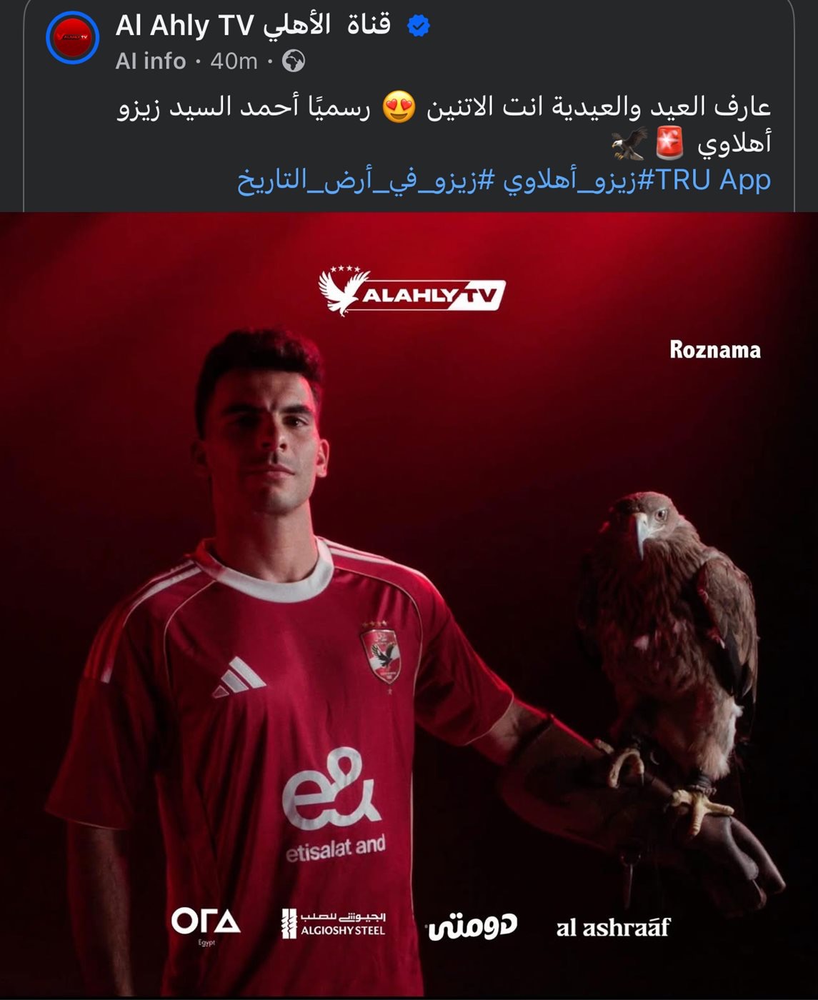 ونشرت القناة عبر صفحتها الرسمية صورة للاعب بصيغة احتفالية، مع تعليق جاء فيه: "عارف العيد والعيدية، أنت الاتنين.. رسميًا أحمد سيد زيزو أهلاوي"، في رسالة تضمنت مزجًا بين التهاني بمناسبة عيد الأضحى والتأكيد على انضمام زيزو إلى القلعة الحمراء.