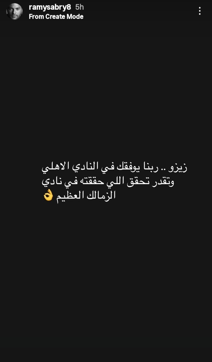 وكتب صبري عبر خاصية الأستوري على حسابه الرسمي"إنستجرام" قائلا " زيزو.. ربنا يوفقك في النادي الأهلي وتقدر تحقق اللي حققته في نادي الزمالك العظيم .