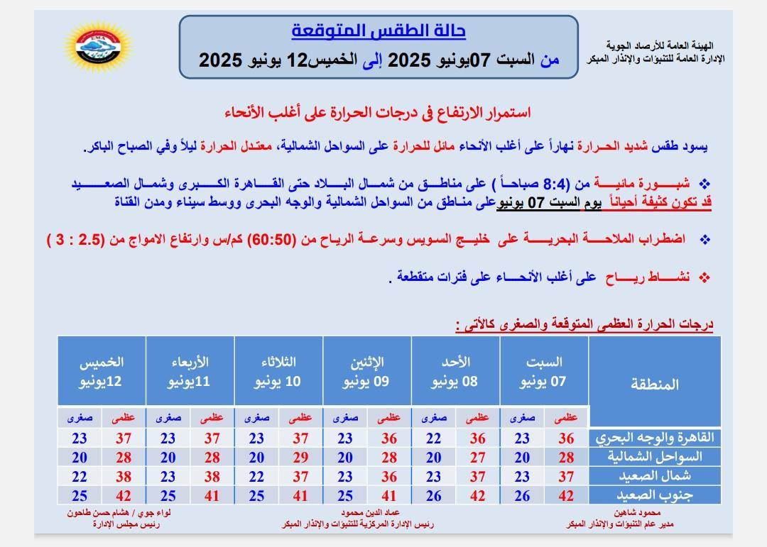 وقالت عضو المركز الإعلامي بهيئة الأرصاد الجوية، إن الأجواء شديدة الحرارة على أغلب الأنحاء والعظمى على القاهرة الكبرى اليوم 36 درجة مئوية بينما جنوب الصعيد 42 درجة مئوية.
