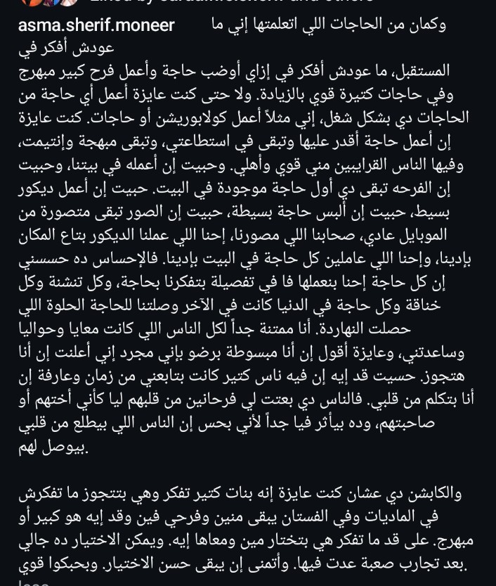 ونشرت أسما شريف منير عبر حسابها الرسمي على موقع التواصل الاجتماعي لتبادل الصور والفيديوهات الانستجرام، بعدما نشرت بوست سابق أوضحت كيف اتخذت القرار لدخول عش الزوجية المرة الثالثة وتابعت: "وكمان من الحاجات اللي اتعلمتها إني ما عودش أفكر في المستقبل، ما عودش أفكر في إزاي أوضب حاجة وأعمل فرح كبير مبهرج وفي حاجات كتيرة قوي بالزيادة".