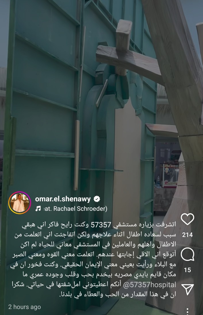 ونشر عمر الشناوي عبر حسابه الرسمي على موقع التواصل الاجتماعي لتبادل الصور والفيديوهات"إنستجرام"، مقطع فيديو به صورا من زيارته للمستشفى، وكتب: " اتشرفت بزيارة مستشفي 57357 وكنت رايح فاكر اني هبقي سبب لسعاده اطفال اثناء علاجهم ولكن اتفاجئت اني اتعلمت من الاطفال واهلهم والعاملين في المستشفي معاني للحياه لم اكن أتوقع اني الاقي إجابتها عندهم".