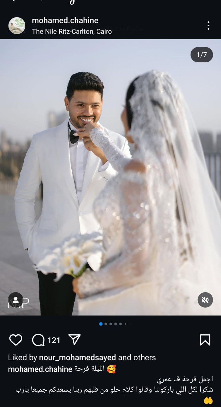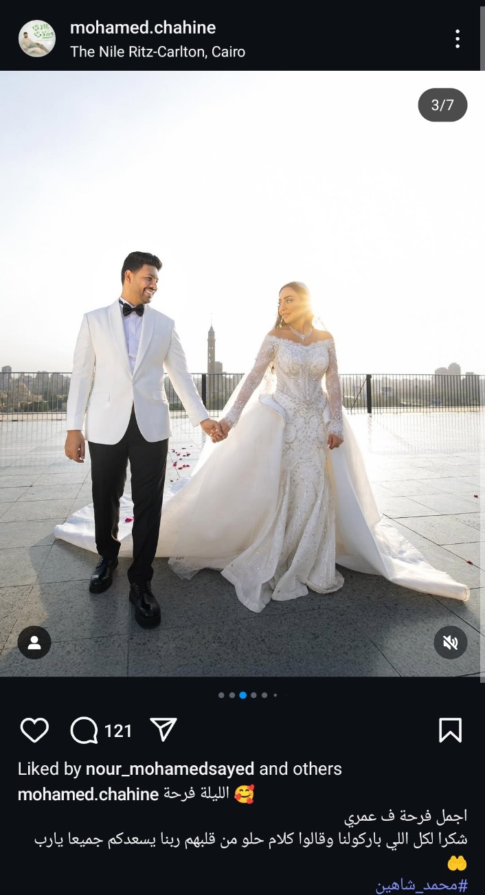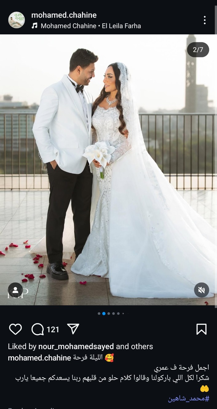 ونشر محمد شاهين عبر حسابه على موقع التواصل الاجتماعي "إنستجرام"، صور تجمعه بزوجته، وكتب: "الليلة فرحة، أجمل فرحة في عمري، شكرا لكل اللي باركولنا وقالوا كلام حلو من قلبهم ربنا يسعدكم جميعا يارب".