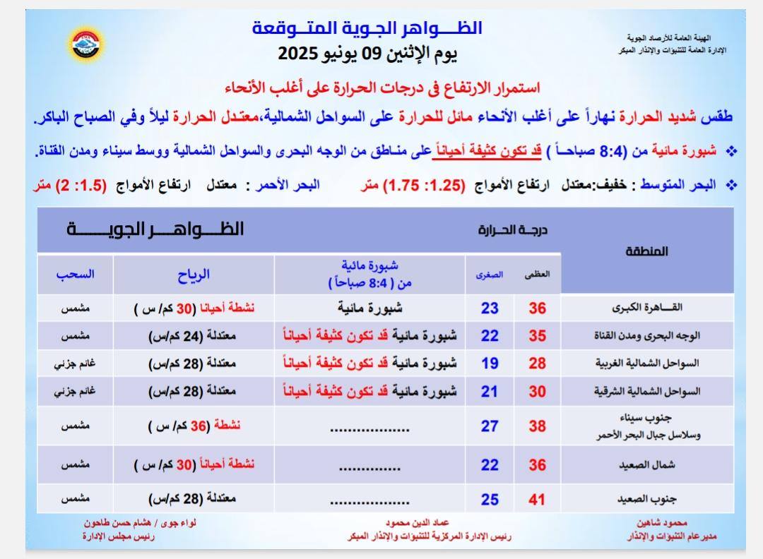 وحذرت الأرصاد الجوية من الشبورة المائية خلال فترات صباح اليوم الأثنين 9 يونيو، قد تكون كثيفة أحياناً على مناطق من الوجه البحرى والسواحل الشمالية ووسط سيناء ومدن القناة.