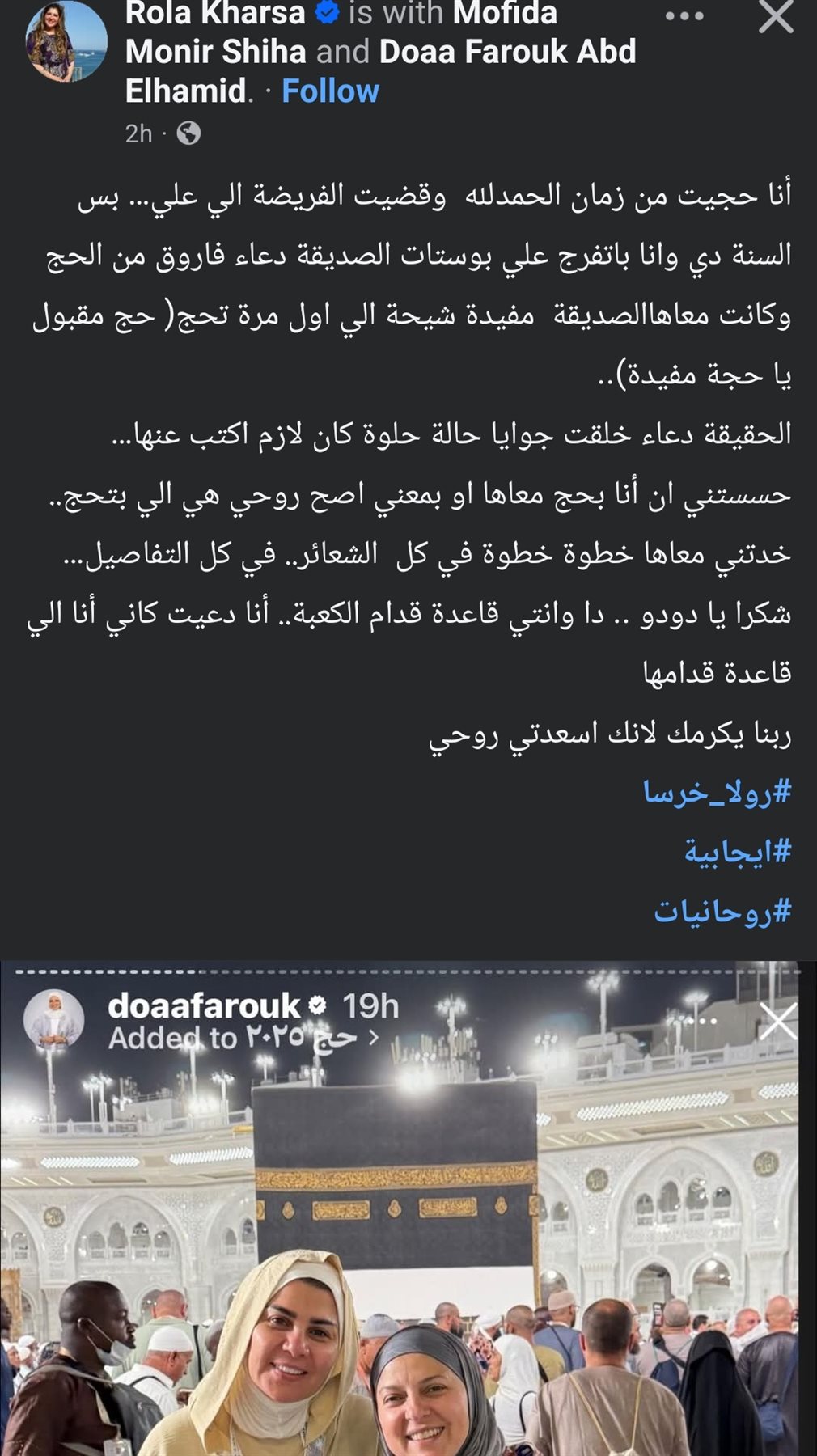 وكتبت عبر حسابها الرسمي على موقع التواصل الاجتماعي الفيسبوك: “أنا حجيت من زمان الحمدلله وقضيت الفريضة الي عليا، السنة دي وانا باتفرج علي بوستات الصديقة دعاء فاروق من الحج وكانت معاها الصديقة مفيدة شيح الي اول مرة تحج ”حج مقبول يا حجة مفيدة".