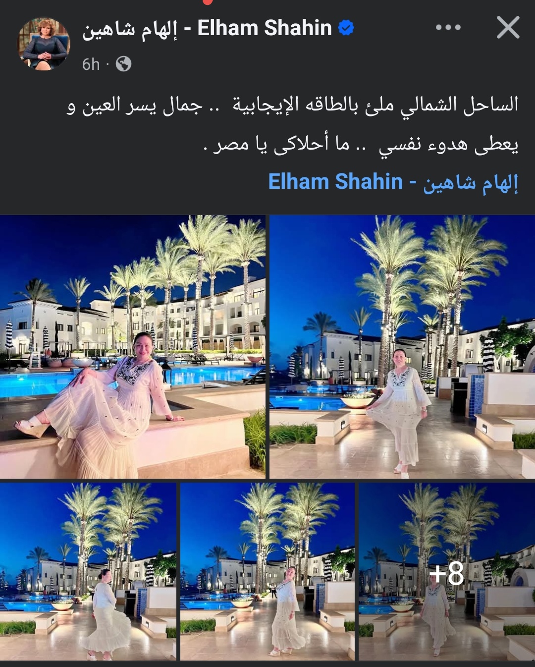 نشرت إلهام شاهين عبر حسابها الرسمي على موقع التواصل الاجتماعي الفيسبوك: “الساحل الشمالي ملئ بالطاقه الإيجابية، جمال يسر العين ويعطى هدوء نفسي، ما أحلاكى يا مصر ”.