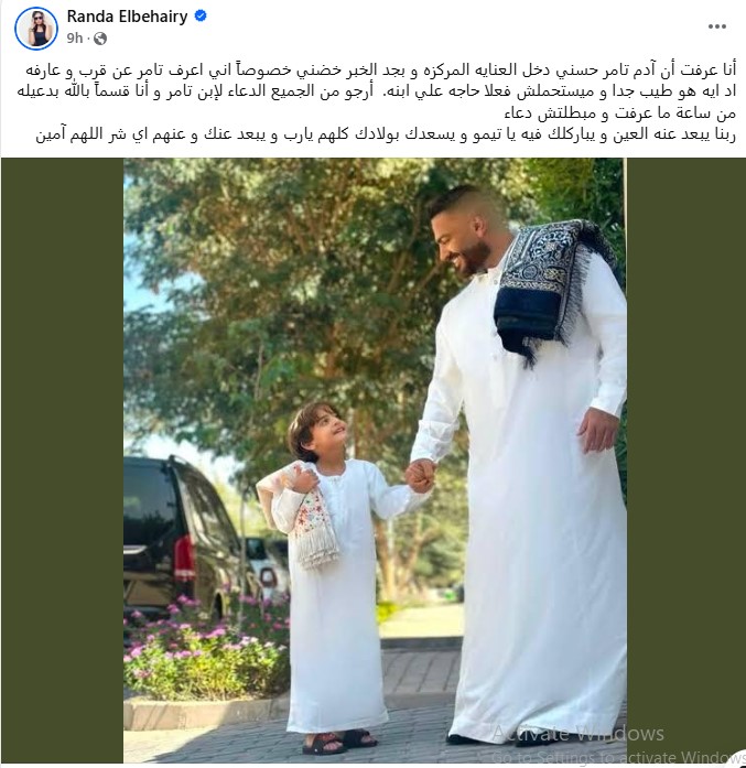 وأضافت: "عارفه اد ايه هو طيب جدا وميستحملش فعلا حاجه علي ابنه، أرجو من الجميع الدعاء لإبن تامر و أنا قسماً بالله بدعيله من ساعة ما عرفت و مبطلتش دعاء".