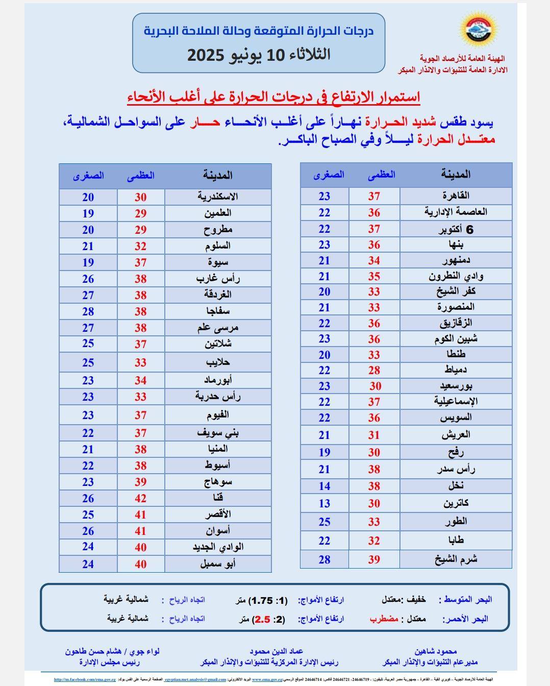وحذرت الهيئة العامة لـ الأرصاد الجوية من الشبورة المائية خلال فترات صباح اليوم الثلاثاء 10 يونيو، قد تكون كثيفة أحياناً على مناطق من الوجه البحري والسواحل الشمالية وسط سيناء ومدن القناة.