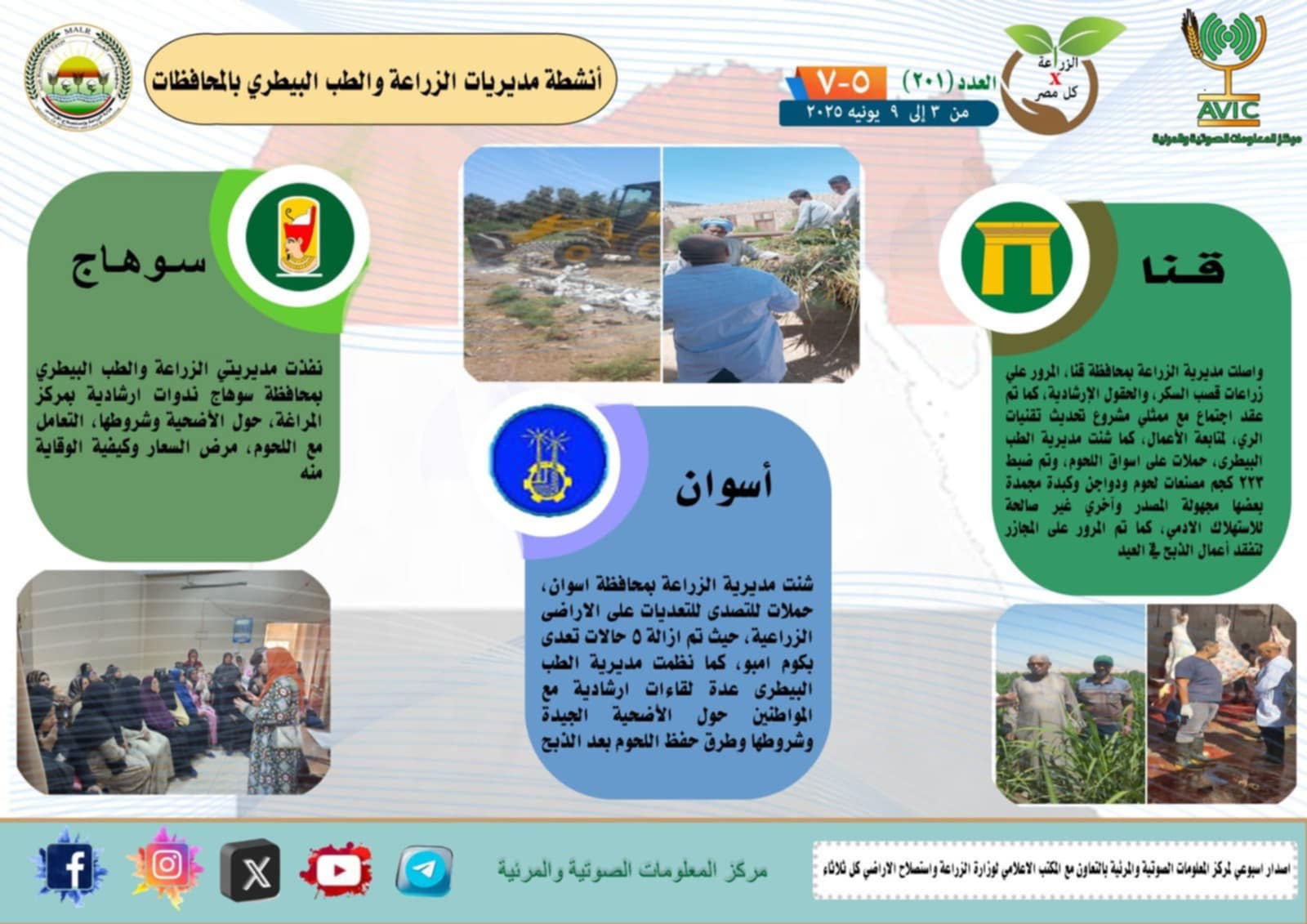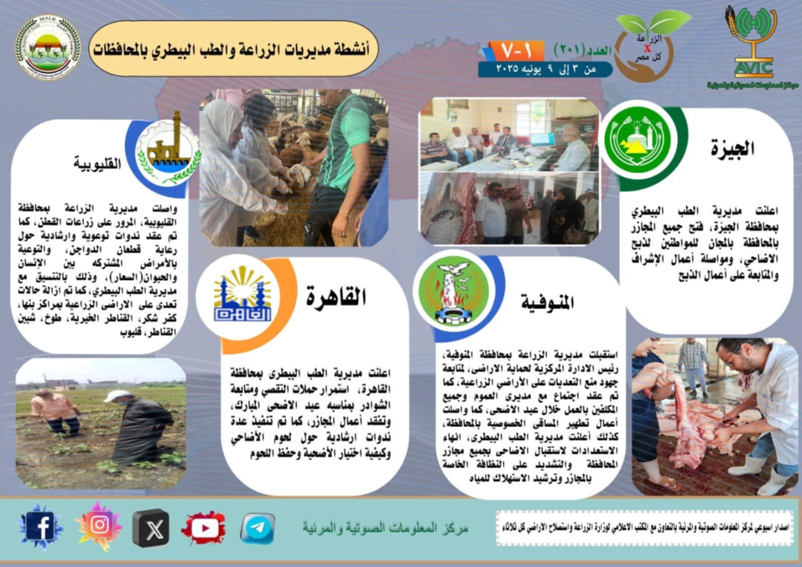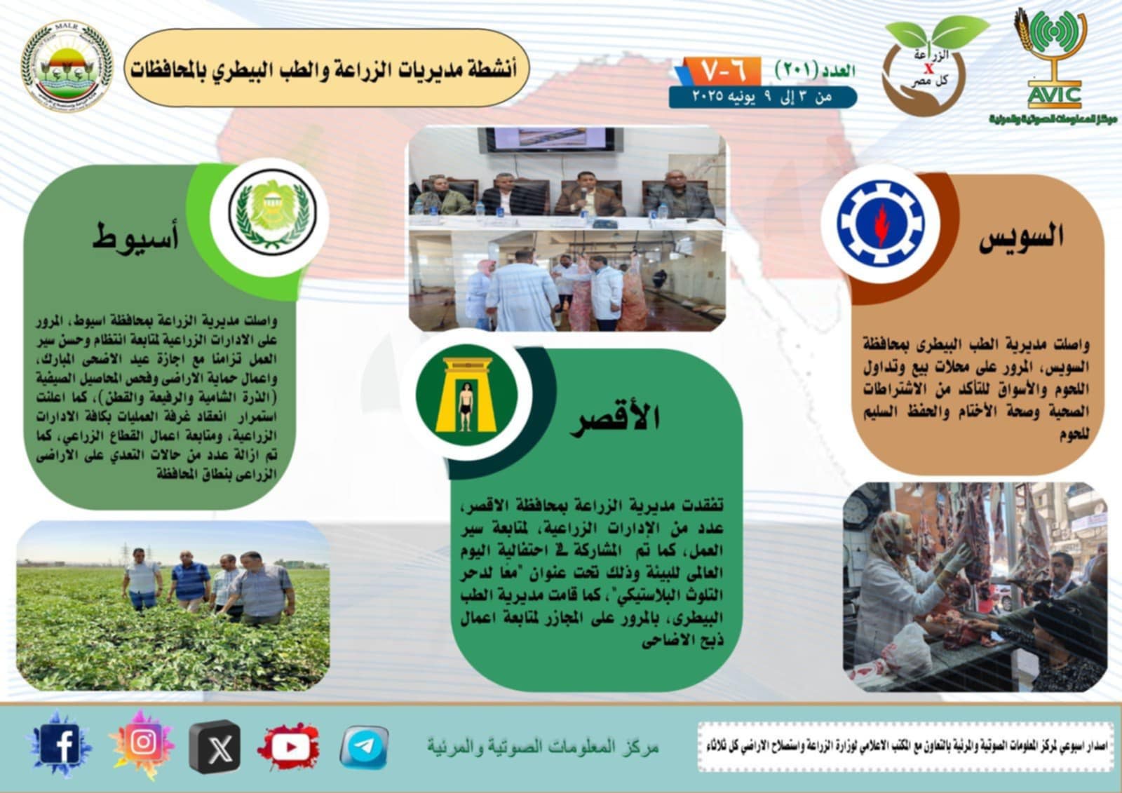 أصدر مركز المعلومات الصوتية والمرئية التابع لوزارة الزراعة واستصلاح الأراضي، والمكتب الاعلامي للوزارة، العدد رقم 201 من اصدار: "الزراعة في كل مصر" بالانفوجراف والفيديو، يوضح الجهود والانشطة التي تقوم بها مديريات الزراعة والطب البيطري بمحافظات الجمهورية خلال الفترة من 3 وحتى 9 يونيه الجاري.
