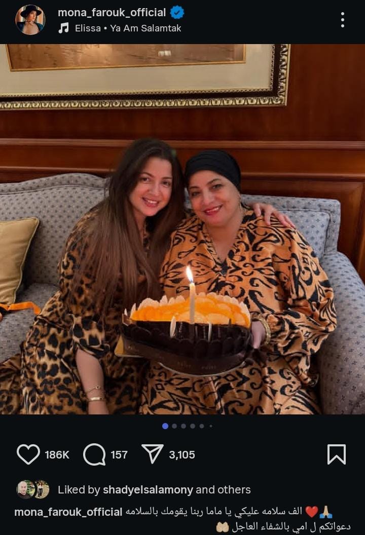 تعرضت والدة الفنانة منى فاروق لوعكة صحية مؤخرًا، وطلبت منى فاروق من جمهورها الدعاء لها، حيث نشرت صور تجمعها بوالدته من خلال حسابها الرسمي عبر موقع تبادل الصور والفديوهات القصيرة “إنستجرام”، وكتبت: “الف سلامة عليكي يا ماما ربنا يقومك بالسلامة دعواتكم لـ امي بالشفاء العاجل”.